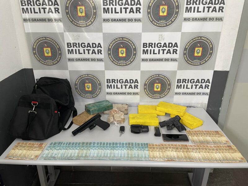 Durante patrulhamento, as equipes do batalhão realizaram a abordagem de um veículo. Na ação foram apreendidos uma pistola, um simulacro de arma de fogo; quatro tijolos de cocaína, três tijolos de crack, além de uma porção adicional também de crack; R$ 5 mil e o veículo utilizado.