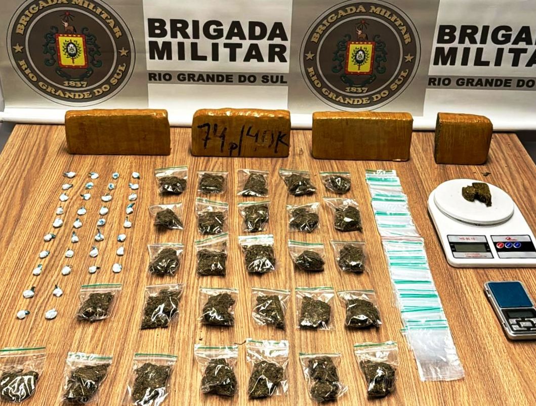 Uma mulher, de 24 anos, foi detida na noite desta sexta-feira, 9, com 2,3 quilos de drogas em Bento Gonçalves. Conforme a Brigada Militar (BM), o caso foi registrado no bairro São Francisco quando ela foi abordada e, em revista, os policiais apreenderam 2,5 tijolos e 29 porções de maconha, 36 porções de cocaína, duas balanças de precisão e um celular.
