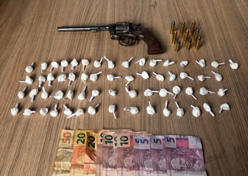 Durante a ação, além da mulher presa, também foram apreendidos um revólver, nove munições, 61 porções de cocaína e R$ 205.