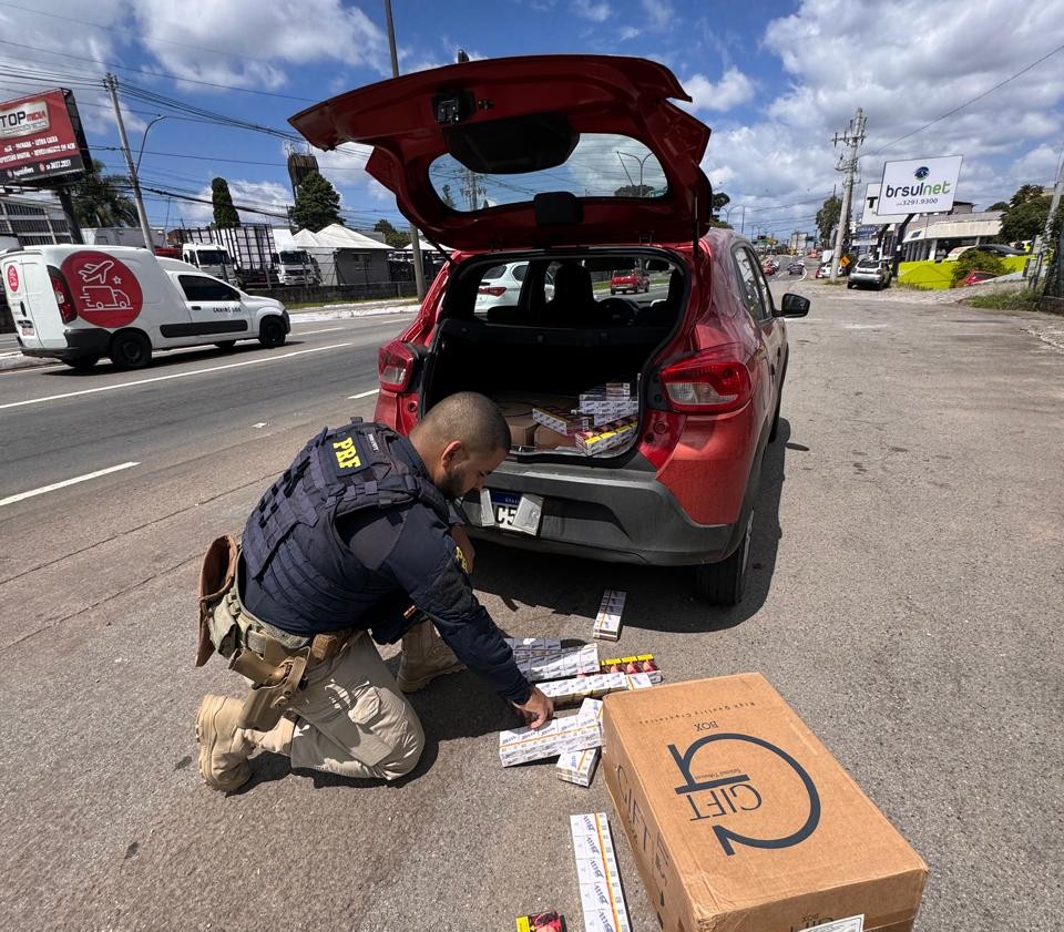 Na fiscalização, os agentes visualizaram, no banco traseiro do motorista, diversas caixas de cigarro de origem estrangeira. Ao ser questionado, o condutor admitiu estar carregado com caixas de cigarros contrabandeados, que totalizavam aproximadamente 4 mil maços.